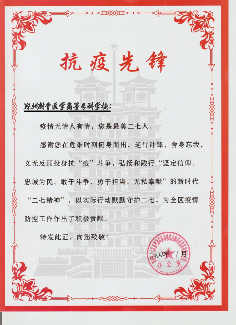 二七區(qū)委常委、紀委書記、監(jiān)委代主任湯曉義代表二七區(qū)新冠肺炎疫情防控領導小組向學校頒發(fā)了“抗疫先鋒”榮譽證書,向參加疫情防控的9名學生送上了鮮花。護理系輔導員蘇于皓榮獲“抗疫先鋒”榮譽稱號。