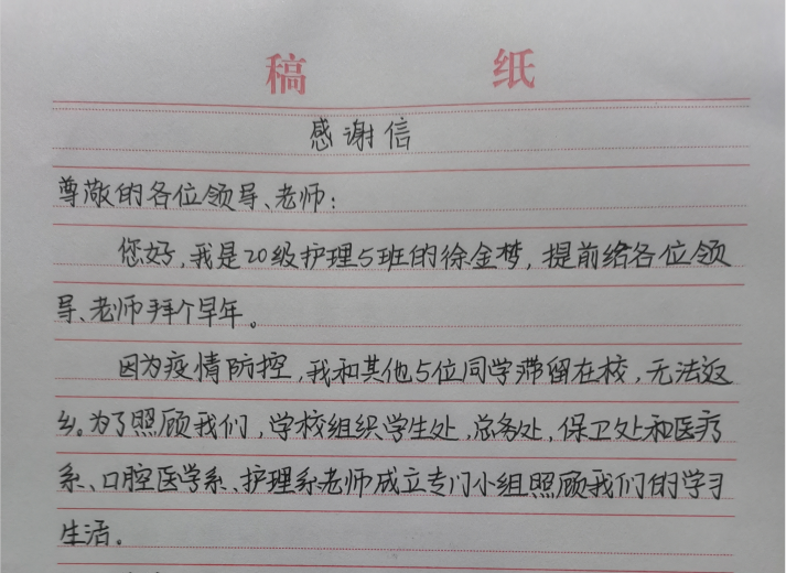 近日,漯河醫(yī)學(xué)高等專科學(xué)校收到了一封特殊的感謝信,它來自因疫情留校的學(xué)生徐金夢(mèng),信中表達(dá)了對(duì)學(xué)校暖心照顧留校學(xué)生的感激之情。