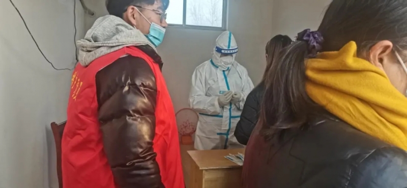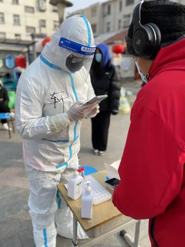 在連續(xù)七次全員核酸檢測試點項目中,為居民建立快速掃碼通道;為了不影響白天正常的全員核酸進程,凌晨四點開始準(zhǔn)備防護物品,為從通訊新天地、銀基等高風(fēng)險地區(qū)返回的密接、次密接居家隔離人員上門做檢測。凌晨的風(fēng),冰冷刺骨,常常手指僵硬不聽使喚;凌晨的地面,在白雪的覆蓋下異常光滑,每一步都充滿危險;身穿防護服在狹窄的樓道中來回穿梭,身形尤為笨拙。