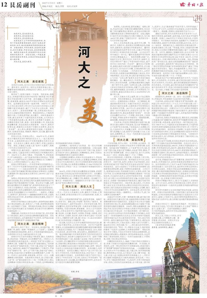 2月23日,《開封日?qǐng)?bào)》整版刊發(fā)河南大學(xué)黨委常委、宣傳部部長(zhǎng)王明欽撰寫的《河大之美》文章。