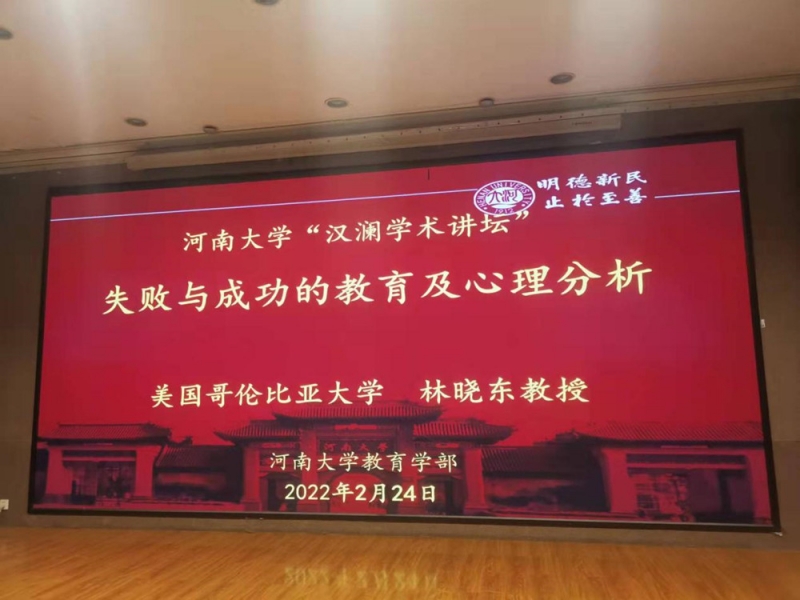 2月24日,作為河南大學(xué)110周年校慶活動(dòng)內(nèi)容之一,美國(guó)哥倫比亞大學(xué)終身教授、耐挫與創(chuàng)新教育國(guó)際聯(lián)合研究中心主任、世界經(jīng)濟(jì)合作與發(fā)展組織咨詢委員會(huì)首席教育專家林曉東教授應(yīng)我校教育學(xué)部邀請(qǐng)做客“河南大學(xué)漢瀾學(xué)術(shù)講壇”,并作了題為《失敗與成功的教育及心理分析》的學(xué)術(shù)報(bào)告,報(bào)告會(huì)通過(guò)線上線下結(jié)合的方式進(jìn)行。