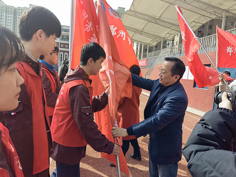 鄭州市第十八中學黨委書記魏勇為志愿服務學生授旗