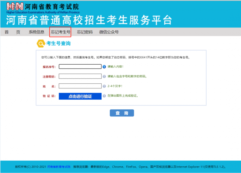 進(jìn)入“河南省教育考試院”網(wǎng)站 (http://www.haeea.cn/),點(diǎn)擊“河南省普通高校招生考生服務(wù)平臺(tái)”區(qū)域,找到“忘記考生號(hào)”頁面,進(jìn)行相應(yīng)操作。