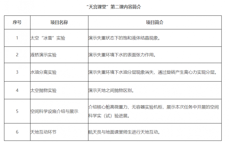 本次太空授課活動繼續(xù)采取天地對話方式進(jìn)行,由航天員在軌演示太空“冰雪”實(shí)驗(yàn)、液橋演示實(shí)驗(yàn)、水油分離實(shí)驗(yàn)、太空拋物實(shí)驗(yàn),介紹與展示空間科學(xué)設(shè)施(授課內(nèi)容介紹附后),旨在傳播普及空間科學(xué)知識,激發(fā)廣大青少年不斷追尋“科學(xué)夢”、實(shí)現(xiàn)“航天夢”的熱情。