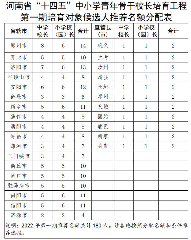 通知指出,實(shí)施河南省“十四五”中原名校長領(lǐng)航培育工程(簡稱“領(lǐng)航工程”),在省級名校長隊(duì)伍中遴選2批共60名領(lǐng)航校(園)長培育對象,依托教育部中學(xué)校長培訓(xùn)中心等國家級領(lǐng)航校長培訓(xùn)基地作為我省培育基地,通過開展深度學(xué)習(xí)、教育研究、專家指導(dǎo)、示范提升等形式,進(jìn)行為期3年的在職連續(xù)培育(每年多次集中,累計(jì)不少于2個月),促進(jìn)培育對象教育思想、理論素養(yǎng)和實(shí)踐創(chuàng)新能力得到全面提升,特色風(fēng)格更加鮮明,成長為豫派教育家型校長和基礎(chǔ)教育領(lǐng)軍人才,輻射帶動我省中小學(xué)校長隊(duì)伍建設(shè)和基礎(chǔ)教育質(zhì)量提升,為實(shí)現(xiàn)教育現(xiàn)代化、辦好人民滿意的教育和使中原更加出彩提供強(qiáng)有力的人才支撐。2022年計(jì)劃遴選首期30名中原名校長領(lǐng)航工程培育對象。