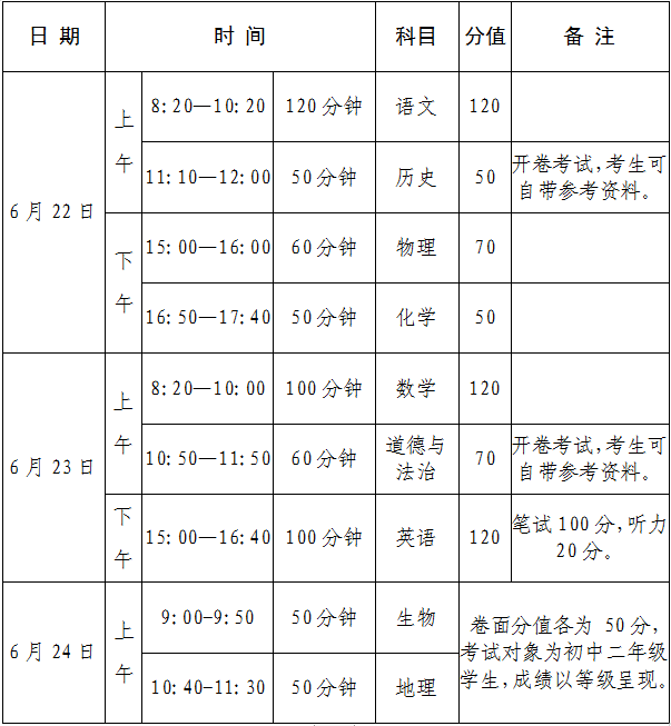 全省統(tǒng)一命題考試的科目為語文、數(shù)學、英語、物理、化學、道德與法治、歷史、生物、地理。生物、地理學科為初中二年級考試科目,成績原則上以A、B、C、D四個等級呈現(xiàn),其中D等不超過5%,具體等級劃分比例和使用辦法由各省轄市、省直管縣(市)制定。英語聽力考試采用光盤播放,各考點要統(tǒng)一配備相關設備。為統(tǒng)籌做好高考分數(shù)公布、高招及疫情防控工作,今年中招考試時間為6月22日-24日,具體科目考試時間和分值見下方《2022年河南省普通高中招生考試方案》。