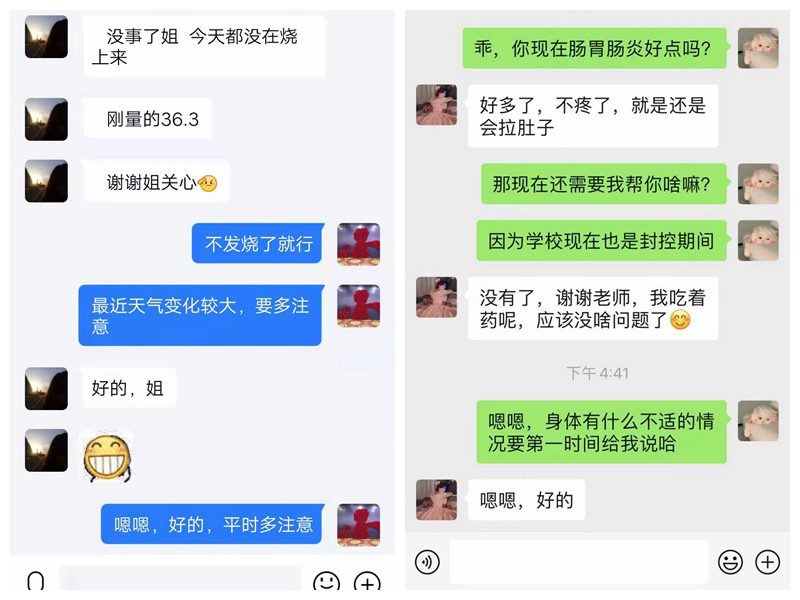 電氣工程及其自動化本1902班劉朝正:非常感謝輔導員老師在封校期間陪在我們身邊,我能切實感受到老師們負責任的態(tài)度與對我們的關懷。我們學院書記和輔導員老師經常來宿舍走訪,了解我們的內心情緒,也使我們本來壓抑的心理有了一定改善。我感受到了書記、老師對我們的關心。我們的輔導員也和我們學生一起溝通,舉行一些班級之間的比賽或者是觀影活動。我認為,這些對于調節(jié)我們的心情有很大的幫助。學校所舉辦的豐富多彩的活動,也讓我們的大學生活更加有趣,讓我覺得封校的生活并沒有那么糟糕,甚至比以往更加充實。疫情嚴重,有學工老師住校陪著我們,我的內心有了一份溫暖,更是有了一份保障。