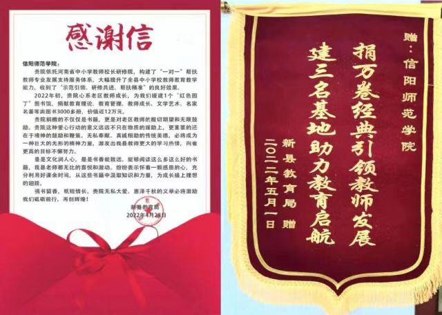 近日,信陽師范學(xué)院收到了新縣教育局送來的感謝信和錦旗,感謝信陽師院“一對一”精準(zhǔn)幫扶建設(shè)新縣教師發(fā)展支持服務(wù)體系,開展“紅色園丁”圖書館援建等各項“扶志”“扶智”行動。感謝信中,新縣教育局對信陽師院助力老區(qū)教育振興給予高度贊揚和誠摯感謝。