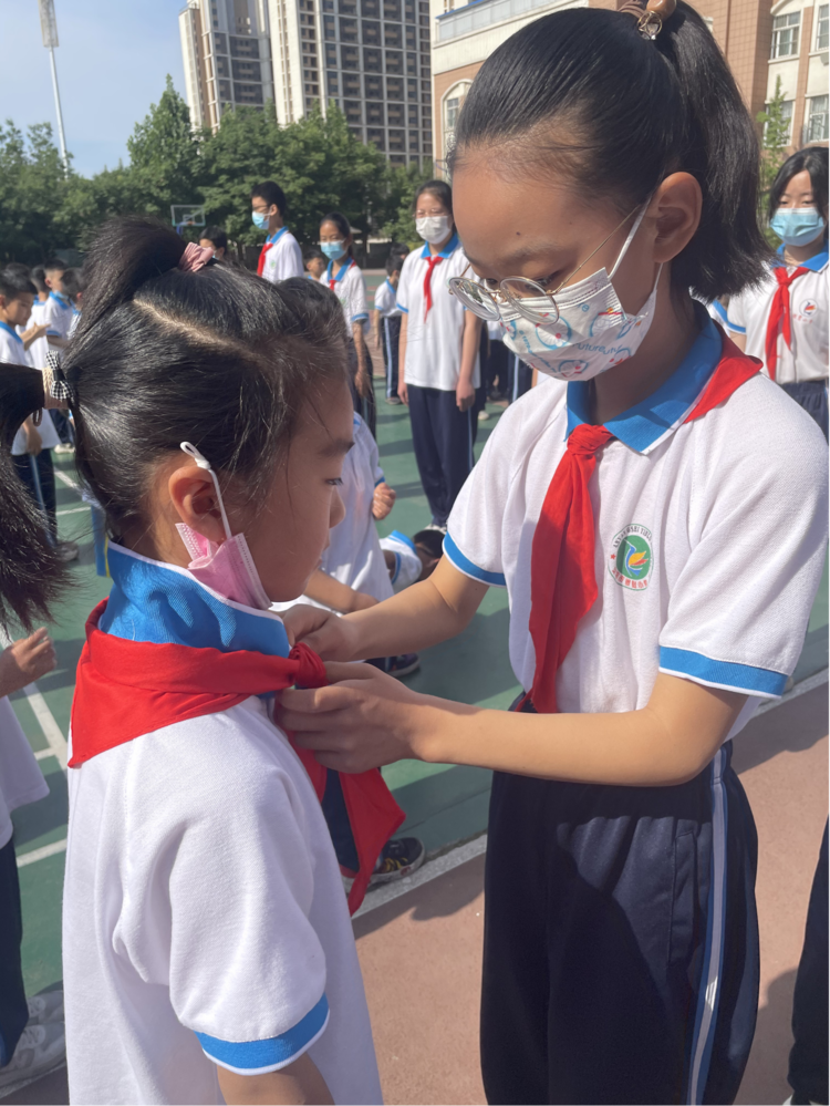 在新中隊(duì)輔導(dǎo)員指導(dǎo)下,五年級老隊(duì)員為新隊(duì)員佩戴紅領(lǐng)巾,老隊(duì)員敬禮,新隊(duì)員還禮。