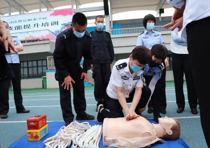 學院教師郭可紅、張謙、王華、靳國軍 4 名和軍訓教官現(xiàn)場講授了各種消防設備的功能及使用方法,并組織教職工體驗了心肺復蘇、繩索打結逃生、高空急救逃生、海姆立克急救法、 防毒面具使用、滅火器使用,強調(diào)了注意事項,認真進行了示范講解,全體教職員工按照急救步驟進行了實際操作演練。