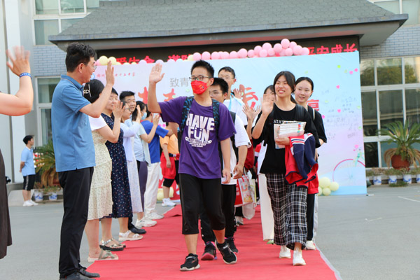 下午3:30分,各班依照學(xué)校精心安排的畢業(yè)典禮活動(dòng)流程準(zhǔn)時(shí)開(kāi)始。在“朝花夕拾,記錄三年學(xué)習(xí)點(diǎn)滴”環(huán)節(jié),同學(xué)們借助視頻中播放的精彩瞬間,靜靜追憶了三年里凝聚著師生情誼的生活點(diǎn)滴和既往故事,見(jiàn)證了自己如何從一個(gè)懵懂少年成為一個(gè)懂得感恩、擁有陽(yáng)光心態(tài)銳意進(jìn)取、心靈澄澈、心存夢(mèng)想的人。在“愛(ài)的寄語(yǔ),送上教師的美好祝福”環(huán)節(jié),同學(xué)們異常安靜地聆聽(tīng)著每一個(gè)教師的祝福和寄語(yǔ),校長(zhǎng)曹軍的畢業(yè)典禮致辭更是讓他們?cè)跍I水朦朧中感受到了成長(zhǎng)于生命、于人生的意義。校長(zhǎng)曹軍在表達(dá)了對(duì)學(xué)生、老師、家長(zhǎng)的崇高敬意和衷心祝福后,懷著“臨行密密縫,意恐遲遲歸”的母親般深情,從“做理性選擇的成長(zhǎng)者、做自我培養(yǎng)的成長(zhǎng)者、做篤行不怠的成長(zhǎng)者”希望同學(xué)們懂得方向比努力更重要,成長(zhǎng)必成功更重要,堅(jiān)持是最大的智慧,祝福大家在未來(lái)的人生路上,不管遇到什么困難挫折,都能愈挫愈勇,向光而生,向美而行,從而找到最好的自己,奔向更好的未來(lái)!在“訴說(shuō)心語(yǔ),聽(tīng)聽(tīng)學(xué)生們的心聲”環(huán)節(jié),學(xué)生們精彩表演著才藝,舞蹈、歌唱、彈奏的高水準(zhǔn)彰顯了他們?nèi)陙?lái)在德智體美勞諸多方面的收獲,訴說(shuō)的心語(yǔ)流露出他們對(duì)學(xué)校的感恩和不舍,他們表示:三年里是眾多老師愛(ài)的哺育讓他們懂得了足夠的努力于人生的重要,一個(gè)個(gè)不期而遇的“小確幸”讓他們“爆發(fā)性長(zhǎng)大、爆發(fā)性覺(jué)悟”,從而擁有了夢(mèng)想和前行的力量。在“溫情感恩,同學(xué)們互贈(zèng)畢業(yè)賀卡”環(huán)節(jié),學(xué)生向班主任、任課老師敬送鮮花,有些孩子在和班主任熱情相擁中已是淚眼朦朧,不舍化做了淚水,悄然濡濕眼眶,感動(dòng)了在場(chǎng)的每一個(gè)人。在“揚(yáng)帆起航,讓我們二十年后再相聚”環(huán)節(jié),學(xué)生們伴著優(yōu)美的歌曲旋律,帶著感恩和善良、帶著家國(guó)情懷和時(shí)代責(zé)任,在畢業(yè)墻上簽名、合影之后,在學(xué)校領(lǐng)導(dǎo)、老師的夾道、擊掌相送中,走過(guò)紅地毯,穿越畢業(yè)門,一起走向了“強(qiáng)國(guó)有我”的美好未來(lái)!