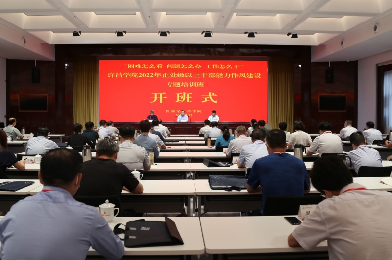 許昌學(xué)院2022年正處級(jí)以上干部能力作風(fēng)建設(shè)專題培訓(xùn)班在紅旗渠干部學(xué)院舉辦,7月12日上午,培訓(xùn)班正式開班。紅旗渠干部學(xué)院副院長石瑞峰,許昌學(xué)院黨委書記郭濤,黨委副書記、校長岳修峰,黨委副書記孫海,副校長崔斌、潘春彩,紀(jì)委書記王東曉出席開班儀式。全校正處級(jí)領(lǐng)導(dǎo)干部參加開班儀式。儀式由岳修峰主持。