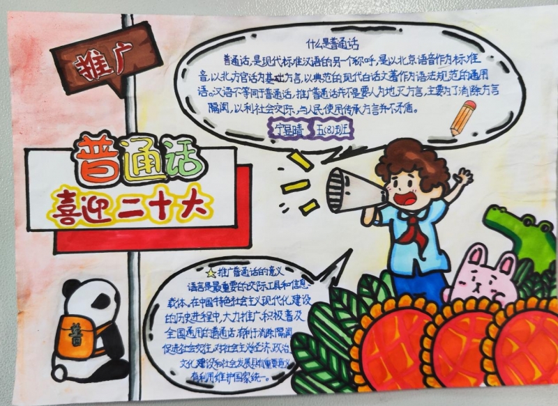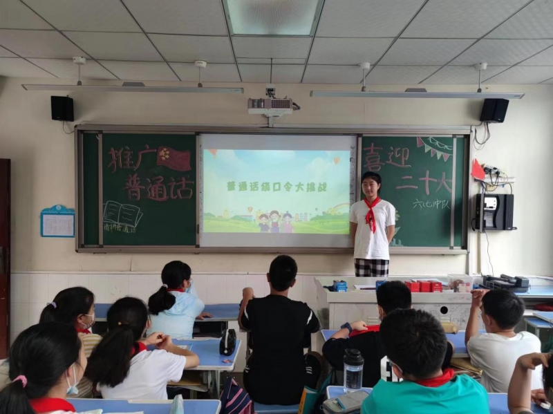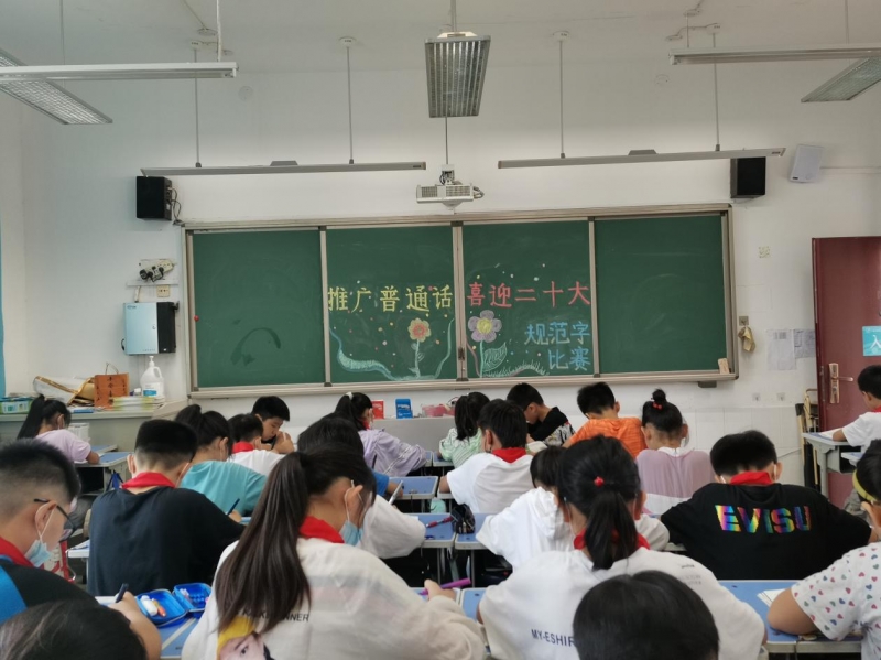 各班以“推廣普通話,喜迎二十大”為主題舉行班會(huì)。在班會(huì)上,同學(xué)們以演講、詩(shī)歌誦讀等形式展現(xiàn)我國(guó)語(yǔ)言文字的魅力,使規(guī)范使用祖國(guó)語(yǔ)言文字和傳承中華優(yōu)秀文化意識(shí)深入師生心靈。五、六年級(jí)開(kāi)展經(jīng)典詩(shī)歌誦讀活動(dòng),各班利用早讀時(shí)間開(kāi)展經(jīng)典誦讀,并評(píng)選出“誦讀之星”。一、二年級(jí)開(kāi)展普通話進(jìn)家庭活動(dòng),每個(gè)學(xué)生在家里教父母說(shuō)普通話,與父母共同體會(huì)說(shuō)普通話的意義。