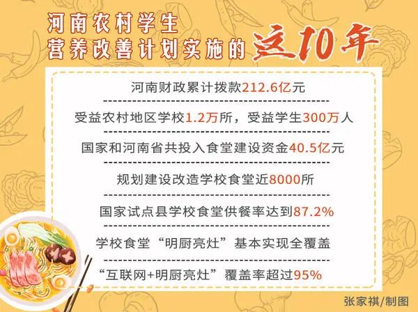2022年,河南省農(nóng)村義務(wù)教育學(xué)生營養(yǎng)改善計劃實施滿10年。河南有關(guān)部門近日發(fā)布的一組數(shù)據(jù)顯示:這10年,我省累計撥款212.6億元,受益農(nóng)村地區(qū)學(xué)校1.2萬所,受益學(xué)生300萬人,我省規(guī)劃建設(shè)改造學(xué)校食堂近8000所,規(guī)劃建設(shè)學(xué)校食堂5187所……河南先后采取一系列有效措施,讓河南農(nóng)村學(xué)生營養(yǎng)餐不斷提質(zhì),從“吃得飽”走向“吃得好”。