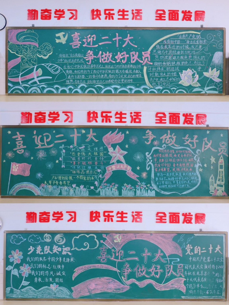 “喜迎二十大 爭做好隊員”、“悅讀向未來”、“學習加油站”、“衛(wèi)生角”、“書香綠意”等欄目詮釋著成長、自信、快樂,充分發(fā)揮環(huán)境育人的作用,營造文明向上,喜迎二十大的濃厚校園氛圍。
