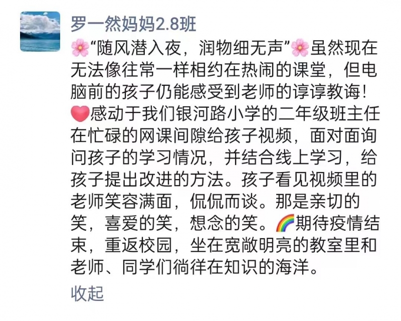 在嚴(yán)峻的疫情形勢(shì)下,學(xué)生居家的身體狀況、作息方式、鍛煉和勞動(dòng)情況,家庭的防疫情況,學(xué)生的心理健康狀況、面對(duì)負(fù)面情緒的排解方式,學(xué)生的線(xiàn)上學(xué)習(xí)狀態(tài)和學(xué)習(xí)質(zhì)量都是老師們關(guān)心的問(wèn)題。老師通過(guò)微信、電話(huà)和視頻多種方式和家長(zhǎng)、學(xué)生互動(dòng)聊天,一別十多天,雙方甚是想念,在見(jiàn)到彼此的瞬間滿(mǎn)屏的笑臉暖人心。在和家長(zhǎng)的交流中我們了解到家長(zhǎng)們對(duì)學(xué)校線(xiàn)上教學(xué)安排的認(rèn)可,認(rèn)為時(shí)間規(guī)劃合理,課程內(nèi)容豐富,學(xué)習(xí)任務(wù)明確,居家勞動(dòng)建議很實(shí)用。在和孩子們的交流中我們了解到大部分孩子都能自覺(jué)安排自己的生活,按時(shí)上課、完成學(xué)習(xí)任務(wù),主動(dòng)承擔(dān)家務(wù)勞動(dòng)。看到孩子們能學(xué)有所獲、自覺(jué)自律;聽(tīng)到家長(zhǎng)的理解和支持,老師們充滿(mǎn)力量!云端會(huì)面,充滿(mǎn)溫暖,家校合力,未來(lái)可期!