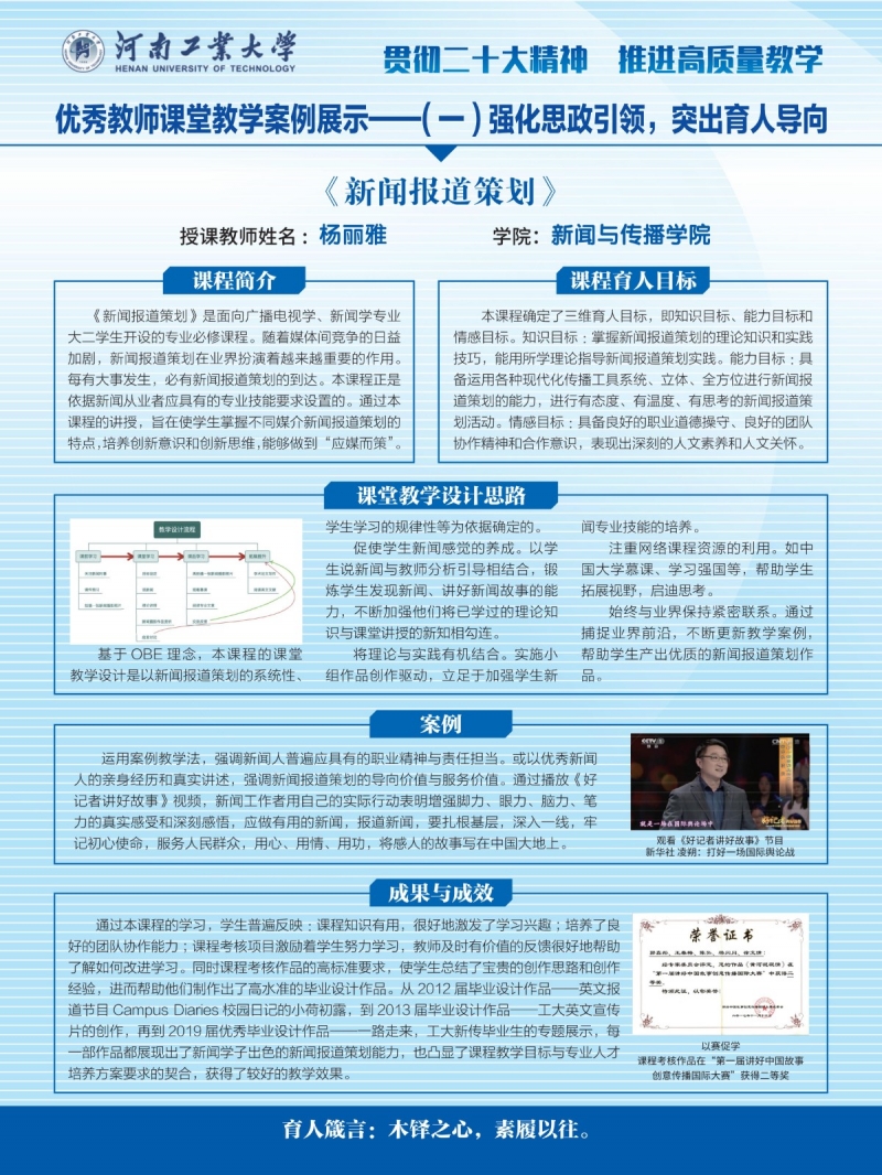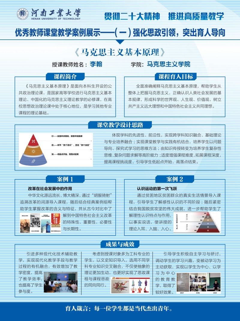 【編者按】偉大時代呼喚偉大精神,崇高事業(yè)需要榜樣引領(lǐng)。在黨的二十大勝利閉幕之際,河南理工大學(xué)教學(xué)隊(duì)伍在校黨委、行政的堅(jiān)強(qiáng)領(lǐng)導(dǎo)下,深入學(xué)習(xí)貫徹二十大精神,認(rèn)真落實(shí)河南省委、學(xué)校黨委“能力作風(fēng)建設(shè)年”要求,全面實(shí)施“課堂教學(xué)質(zhì)量提升年專項(xiàng)行動”,準(zhǔn)確把握科技是第一生產(chǎn)力、人才是第一資源、創(chuàng)新是第一動力的豐富內(nèi)涵,踔厲奮發(fā)、努力拼搏,在推進(jìn)有特色一流工業(yè)大學(xué)新征程中,涌現(xiàn)出一批用平凡書寫非凡的教書育人先鋒榜樣,凝聚了一批優(yōu)秀教育課堂教學(xué)成果。為錨定雙一流、聚焦高質(zhì)量,充分發(fā)揮先進(jìn)典型示范引領(lǐng)作用,全面推進(jìn)課程思政建設(shè),弘揚(yáng)優(yōu)良教學(xué)質(zhì)量文化,激發(fā)教師潛心教學(xué),倡導(dǎo)博學(xué)、奉獻(xiàn)的教風(fēng),特推出優(yōu)秀教師教育教學(xué)成果系列展示,努力匯聚起昂揚(yáng)奮進(jìn)的蓬勃力量,進(jìn)一步提升培根鑄魂育新人能力和水平,為糧食安全、中原崛起、民族復(fù)興培養(yǎng)造就更多德才兼?zhèn)洹⒖爱?dāng)重任的時代新人而不懈努力。