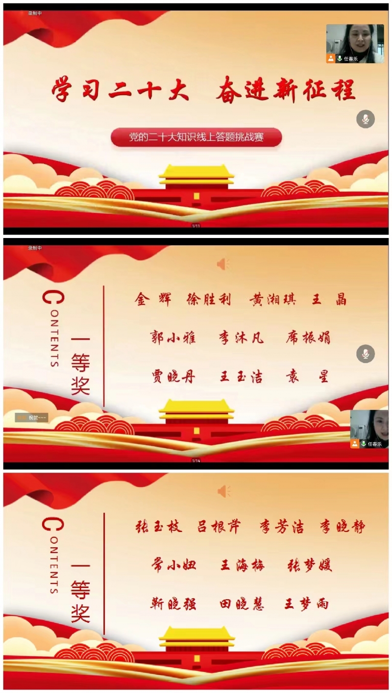首先,全體教師利用騰訊會(huì)議和微信問(wèn)卷星開(kāi)展了“學(xué)習(xí)二十大,奮進(jìn)新征程”——黨的二十大知識(shí)線上答題,通過(guò)完成40道專題知識(shí)檢驗(yàn)教師對(duì)二十大精神的學(xué)習(xí)成果,兩輪答題共產(chǎn)生學(xué)習(xí)標(biāo)兵20名。