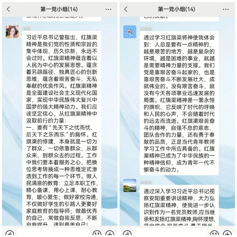 三個(gè)黨小組組織各組同志結(jié)合線上教學(xué)和居家防疫的實(shí)際情況,依次對(duì)學(xué)習(xí)紅旗渠精神做了感悟發(fā)言——“對(duì)工作埋頭苦干、精益求精;對(duì)生活艱苦奮斗、樂(lè)觀向上;對(duì)學(xué)生嚴(yán)慈相濟(jì),真心實(shí)意”“愛(ài)心、耐心、細(xì)心三心俱到,善于發(fā)現(xiàn),多鼓勵(lì),培養(yǎng)學(xué)生健康的人格,樹(shù)立學(xué)生的自信心”“用當(dāng)年修建紅旗渠的干勁,拼勁,闖勁,主動(dòng)擔(dān)當(dāng)作為,克服艱難險(xiǎn)阻,大膽迎難而上”……通過(guò)學(xué)習(xí)和交流,全體黨員老師表示要以紅旗渠精神作為自己照鏡子、正衣冠的生動(dòng)教材,反思自己、檢查自己、激勵(lì)自己。