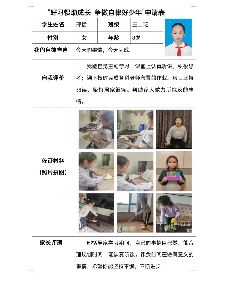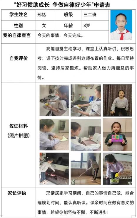 日日行不怕千萬(wàn)里,時(shí)時(shí)做不懼千萬(wàn)事。孩子們開(kāi)啟了為期兩周的自律養(yǎng)成階段,他們對(duì)照標(biāo)準(zhǔn),嚴(yán)格要求自己,積極參與線上學(xué)習(xí),按時(shí)完成學(xué)習(xí)任務(wù),主動(dòng)參與閱讀、勞動(dòng)、運(yùn)動(dòng)等實(shí)踐活動(dòng)。在評(píng)選階段,各班的學(xué)生積極參與活動(dòng),最終通過(guò)自主申報(bào),班主任推選出了一批優(yōu)秀的“自律好少年”。在自主申報(bào)階段,自律小少年們嚴(yán)格對(duì)照評(píng)價(jià)標(biāo)準(zhǔn),制定自己居家學(xué)習(xí)生活計(jì)劃,嚴(yán)格執(zhí)行學(xué)習(xí)、生活、運(yùn)動(dòng)和閱讀評(píng)價(jià)標(biāo)準(zhǔn)。孩子們以自己的實(shí)際行動(dòng)裝扮著屬于自己榮耀的那份申請(qǐng)表!一字一句都是自我肯定,一張張佐證照片都是努力的見(jiàn)證!每一位參與活動(dòng)的孩子都是最棒的,因?yàn)樗麄兣`行 “自律自強(qiáng) 專注踏實(shí) 勤勉學(xué)習(xí)”的要求,用實(shí)際行動(dòng)讓老師和家長(zhǎng)們放心。