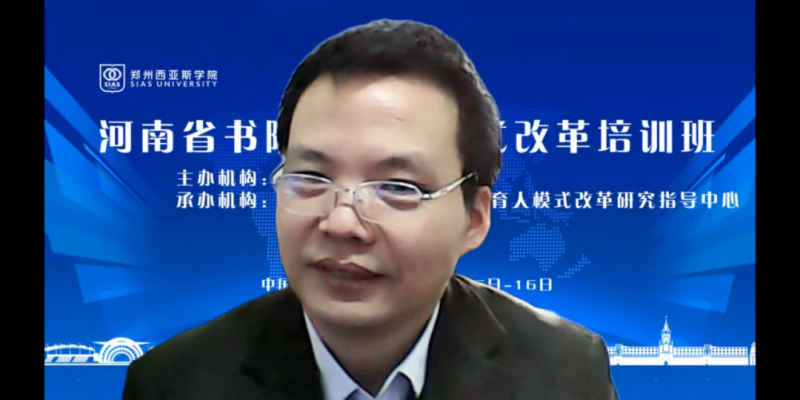 12月15日—16日,由省教育廳主辦,河南省高等學(xué)校書院制育人模式改革研究指導(dǎo)中心和鄭州西亞斯學(xué)院承辦的河南省高等學(xué)校書院制育人模式改革培訓(xùn)班在該校舉行。河南省教育廳黨組成員、副廳長(zhǎng)、一級(jí)巡視員刁玉華,河南省教育廳高教處處長(zhǎng)張水潮,北京航空航天大學(xué)教務(wù)部部長(zhǎng)錢政,溫州大學(xué)教育學(xué)院黨委書記兼副院長(zhǎng)何毅,北京理工大學(xué)人文與社會(huì)科學(xué)學(xué)院研究員、博士生導(dǎo)師龐海芍,河南省高等學(xué)校書院制育人模式改革研究指導(dǎo)中心主任許圣道,鄭州西亞斯學(xué)院創(chuàng)辦人、理事長(zhǎng)陳肖純博士,學(xué)校黨委書記馬建生等校領(lǐng)導(dǎo)和全省各高校書院制工作負(fù)責(zé)人出席。培訓(xùn)以線上方式展開,馬建生主持開幕式。