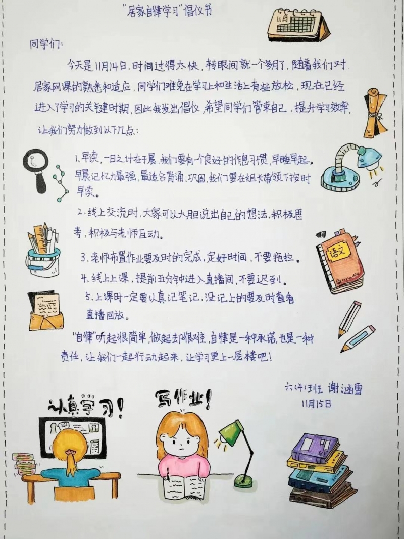 發(fā)揮課堂教學(xué)主渠道作用,推進(jìn)德育融入學(xué)科教學(xué)。如道法課堂《中華民族一家親》,通過(guò)云游祖國(guó)大好河山,讓學(xué)生了解各民族的風(fēng)土人情,理解和尊重不同民族的文化。語(yǔ)文學(xué)科依托習(xí)作課,開(kāi)展“給心心念念的老師、小伙伴寫(xiě)一封信”“配合疫情防控”倡議書(shū)、“居家自律學(xué)習(xí)”倡議書(shū)的活動(dòng),孩子們有話可說(shuō)、有事可寫(xiě),潛移默化開(kāi)展感恩教育。英語(yǔ)學(xué)科以“禮贊二十大 我為中國(guó)代言”為主題,讓小水滴說(shuō)一說(shuō)眼中的中國(guó),將英語(yǔ)教學(xué)與“愛(ài)國(guó)教育”有機(jī)結(jié)合。