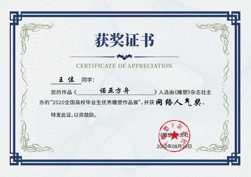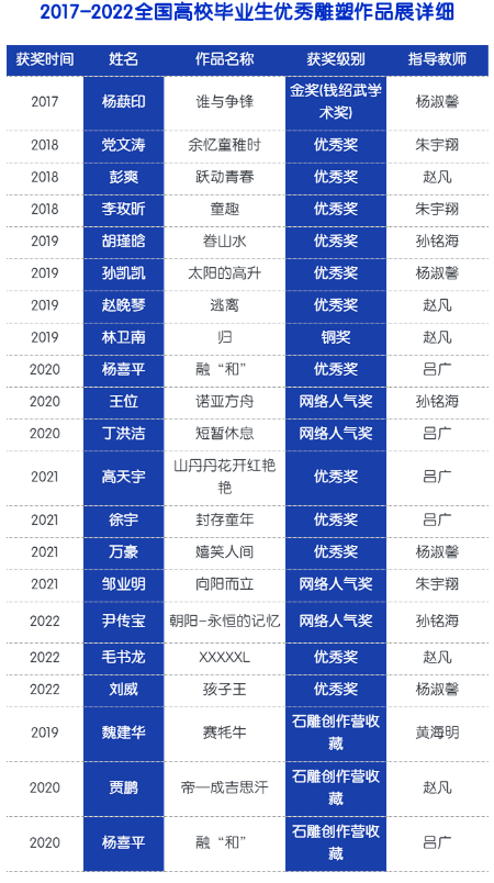 “王子云藝術(shù)獎” 自2009年由西安美術(shù)學(xué)院發(fā)起設(shè)立,面向全國高等藝術(shù)院校,充分發(fā)揮王子云先生研究成果和西安美術(shù)學(xué)院注重周秦漢唐等傳統(tǒng)藝術(shù)教學(xué)與研究利用的學(xué)科優(yōu)勢,匯聚全國專業(yè)學(xué)術(shù)、教學(xué)力量,堅持實踐與理論并重的原則設(shè)立獎項,鼓勵青年學(xué)生開闊學(xué)術(shù)視野,勇于探索創(chuàng)新,對中國古代雕塑的造型語言和東方美學(xué)特征展開系統(tǒng)的研究,尋找其當(dāng)代人文價值,并通過創(chuàng)作實踐和理論研究,探討文脈傳承及其當(dāng)代性轉(zhuǎn)換等問題,在時代美學(xué)特征、雕塑造型語言與方法、當(dāng)代雕塑教育模式及其人才培養(yǎng)等方面體現(xiàn)出特色與優(yōu)勢。2021年第十三屆藝術(shù)獎評選中學(xué)院由導(dǎo)師朱宇翔指導(dǎo),畢業(yè)生鄒業(yè)明作品《向陽而立》,呂廣指導(dǎo)的畢業(yè)生徐宇作品《封存童年》首次入選此平臺展覽。2022年,第十四屆獎項評選中由楊淑馨副教授指導(dǎo)的畢業(yè)生劉威作品《孩子王》榮獲優(yōu)秀獎。