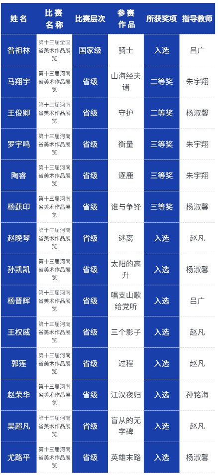 全國美術(shù)作品展覽,簡稱全國美展,是我國最高規(guī)格、最大規(guī)模的國家級美術(shù)作品展覽,每五年舉辦一次。主辦單位為中華人民共和國文化部、中國文學(xué)藝術(shù)界聯(lián)合會和中國美術(shù)家協(xié)會。為沖刺全國美術(shù)作品展,我省首先舉辦了展覽,在第十三屆河南省美術(shù)作品展中,鄭州輕工業(yè)大學(xué)易斯頓美術(shù)學(xué)院雕塑學(xué)子入選雕塑作品13件、2人獲得二等獎、3人獲得三等級,在全省高校中名列前茅,其中昝祖林同學(xué)的作品《騎士》入選第十三屆全國美術(shù)作品展。