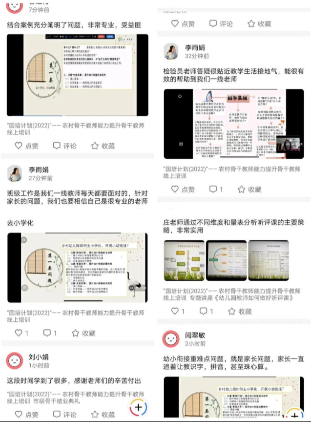 本次兩個骨干教師培訓項目,均采取“13+2”的形式進行,以同步在線、異步在線、同步異步相結合、培訓平臺與微信平臺切換的方式交替進行。運用現(xiàn)代信息技術規(guī)范管理,搭建在培訓學員網(wǎng)絡學習平臺、甄選優(yōu)質(zhì)學前教育網(wǎng)絡公司,力邀南京、上海等地近40名知名專家園長做線上直播互動,積極創(chuàng)設條件為提高線上培訓質(zhì)量保駕護航。