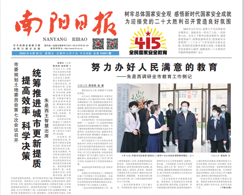 2022年4月14日,南陽市委書記朱是西深入中心城區(qū)部分學(xué)校、市教育局調(diào)研教育工作,強(qiáng)調(diào)要緊扣提高學(xué)生綜合素質(zhì)、提高被教育者幸福指數(shù)、提高對經(jīng)濟(jì)社會發(fā)展貢獻(xiàn)度、提高人民群眾滿意度,著力提升教師待遇、提升辦學(xué)條件,推動南陽教育事業(yè)不斷邁上新臺階、取得新突破。