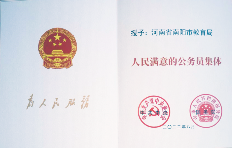 2022年8月30日,南陽市教育局被中共中央、國務(wù)院授予全國“人民滿意的公務(wù)員集體”榮譽(yù)稱號,是全國市、縣級教育局唯一獲此殊榮的單位。