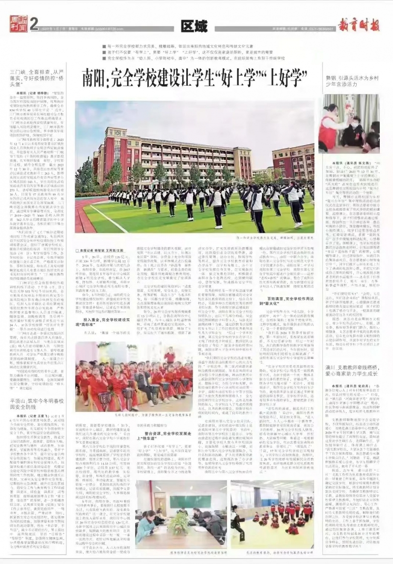2022年1月7日,《教育時(shí)報(bào)》以《南陽:完全學(xué)校建設(shè)讓學(xué)生“好上學(xué)”“上好學(xué)”》為題,專版報(bào)道南陽市完全學(xué)校建設(shè)。該報(bào)道被河南教育時(shí)報(bào)評為2022河南十大區(qū)域教育創(chuàng)新案例,排名第一位。
