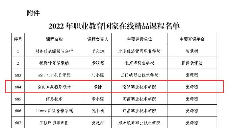 1月12日,教育部公布了2022年職業(yè)教育國家在線精品課程評選結果,濮陽職業(yè)技術學院教師李靜主持的“面向對象程序設計”課程成功立項,實現(xiàn)了學校教學工程項目在國家級層面的新跨越。