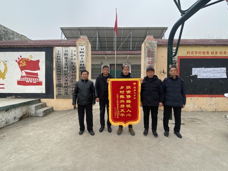 1月11日上午,衛(wèi)輝市上樂村鎮(zhèn)后天平村委會(huì)將一面印有“捐資修路暖人心,鄉(xiāng)村振興后天平”的錦旗贈(zèng)送給河南工學(xué)院,對(duì)學(xué)校捐資修筑防汛道路表示感謝。