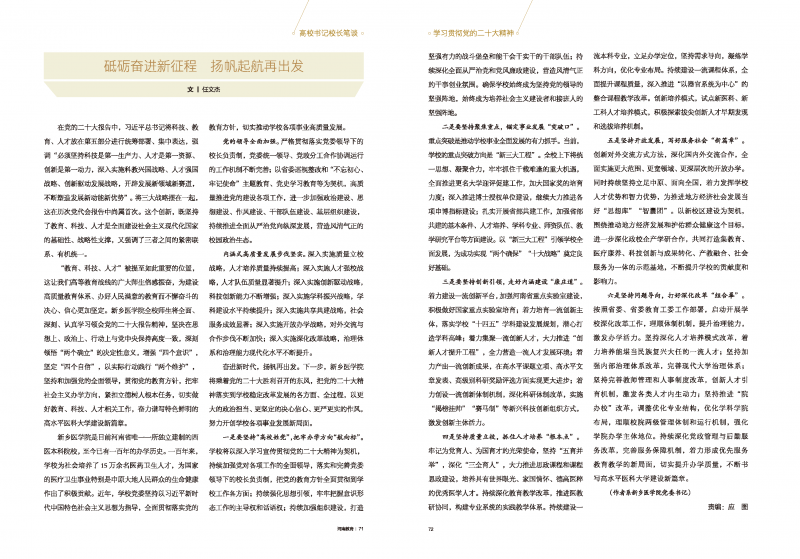 “教育、科技、人才”被提至如此重要的位置,這讓我們高等教育戰(zhàn)線的廣大師生倍感振奮,為建設(shè)高質(zhì)量教育體系、辦好人民滿意的教育而不懈奮斗的決心、信心更加堅(jiān)定。新鄉(xiāng)醫(yī)學(xué)院全校師生將全面、深刻、認(rèn)真學(xué)習(xí)領(lǐng)會(huì)黨的二十大報(bào)告精神,堅(jiān)決在思想上、政治上、行動(dòng)上與黨中央保持高度一致,深刻領(lǐng)悟“兩個(gè)確立”的決定性意義,增強(qiáng)“四個(gè)意識(shí)”,堅(jiān)定“四個(gè)自信”,以實(shí)際行動(dòng)踐行“兩個(gè)維護(hù)”,堅(jiān)持和加強(qiáng)黨的全面領(lǐng)導(dǎo),貫徹黨的教育方針,把牢社會(huì)主義辦學(xué)方向,緊扣立德樹(shù)人根本任務(wù),切實(shí)做好教育、科技、人才相關(guān)工作,奮力譜寫(xiě)特色鮮明的高水平醫(yī)科大學(xué)建設(shè)新篇章。