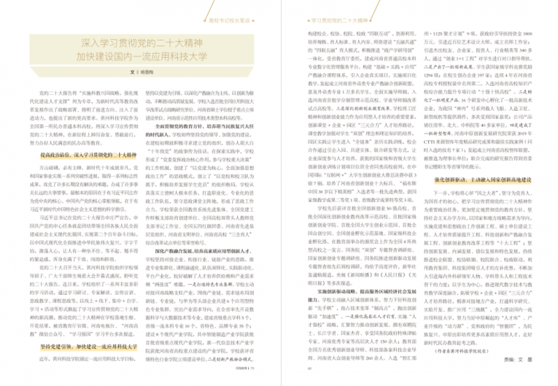 黨的二十大報(bào)告將“實(shí)施科教興國(guó)戰(zhàn)略,強(qiáng)化現(xiàn)代化建設(shè)人才支撐”列為專章,為新時(shí)代高等教育改革發(fā)展作出了戰(zhàn)略部署、指明了前進(jìn)方向、注入了前進(jìn)動(dòng)力,也提出了新的更高要求。黃河科技學(xué)院作為全國(guó)第一所民辦普通本科高校,將深入學(xué)習(xí)宣傳貫徹黨的二十大精神,在新征程上踔厲奮發(fā)、勇毅前行,努力辦好人民滿意的民辦高等教育。