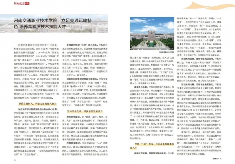 河南交通職業(yè)技術(shù)學(xué)院始建于1953年,2004年成為高職院校,2015年成為“河南省職業(yè)教育品牌示范院校”,2019年成為“國(guó)家優(yōu)質(zhì)專科高等職業(yè)院校”,2020年成為“河南省’雙高工程'建設(shè)單位”,2022年成為“全國(guó)100所高職院校學(xué)生發(fā)展指數(shù)優(yōu)秀院校”。學(xué)校是省教育廳、省交通運(yùn)輸廳共建高職院校和河南交通運(yùn)輸省級(jí)骨干職業(yè)教育集團(tuán)牽頭院校,同時(shí)也是河南省教育系統(tǒng)“人人持證、技能河南”領(lǐng)導(dǎo)小組辦公室、河南省“1+X”證書(shū)制度試點(diǎn)工作協(xié)調(diào)推進(jìn)辦公室依托單位。近年,學(xué)校立足交通運(yùn)輸特色,堅(jiān)持立德樹(shù)人、深化改革、“三能”教育,不斷增強(qiáng)適應(yīng)性,大力培養(yǎng)高素質(zhì)技術(shù)技能人才,努力把習(xí)近平總書(shū)記對(duì)職業(yè)教育“大有可為”的殷切期盼轉(zhuǎn)化為“大有作為”的生動(dòng)實(shí)踐。