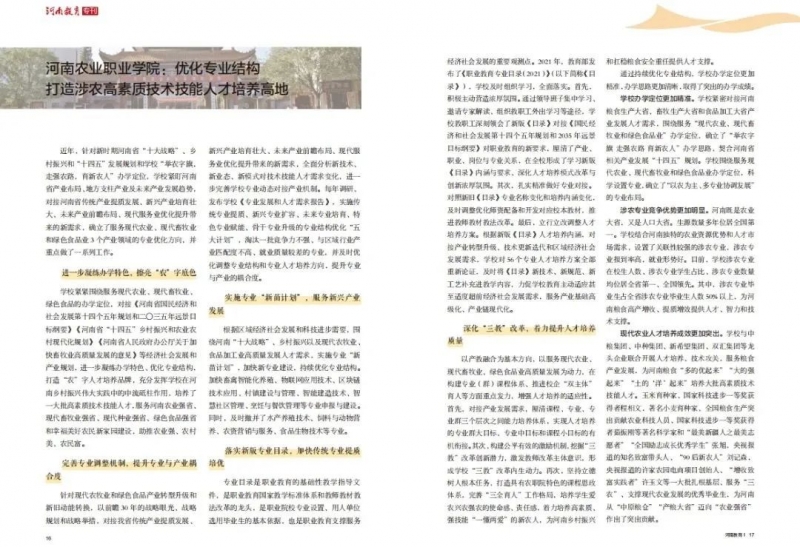 學(xué)校緊緊圍繞服務(wù)現(xiàn)代農(nóng)業(yè)、現(xiàn)代畜牧業(yè)、綠色食品的辦學(xué)定位,對(duì)接《河南省國民經(jīng)濟(jì)和社會(huì)發(fā)展第十四個(gè)五年規(guī)劃和二〇三五年遠(yuǎn)景目標(biāo)綱要》《河南省“十四五”鄉(xiāng)村振興和農(nóng)業(yè)農(nóng)村現(xiàn)代化規(guī)劃》《河南省人民政府辦公廳關(guān)于加快畜牧業(yè)高質(zhì)量發(fā)展的意見》等經(jīng)濟(jì)社會(huì)發(fā)展和產(chǎn)業(yè)規(guī)劃,進(jìn)一步凝練辦學(xué)特色、優(yōu)化專業(yè)結(jié)構(gòu),打造“農(nóng)”字人才培養(yǎng)品牌,充分發(fā)揮學(xué)校在河南鄉(xiāng)村振興偉大實(shí)踐中的中流砥柱作用,培養(yǎng)了一大批高素質(zhì)技術(shù)技能人才,服務(wù)河南農(nóng)業(yè)強(qiáng)省、現(xiàn)代畜牧業(yè)強(qiáng)省、現(xiàn)代種業(yè)強(qiáng)省、綠色食品強(qiáng)省和幸福美好農(nóng)民新家園建設(shè),助推農(nóng)業(yè)強(qiáng)、農(nóng)村美、農(nóng)民富。