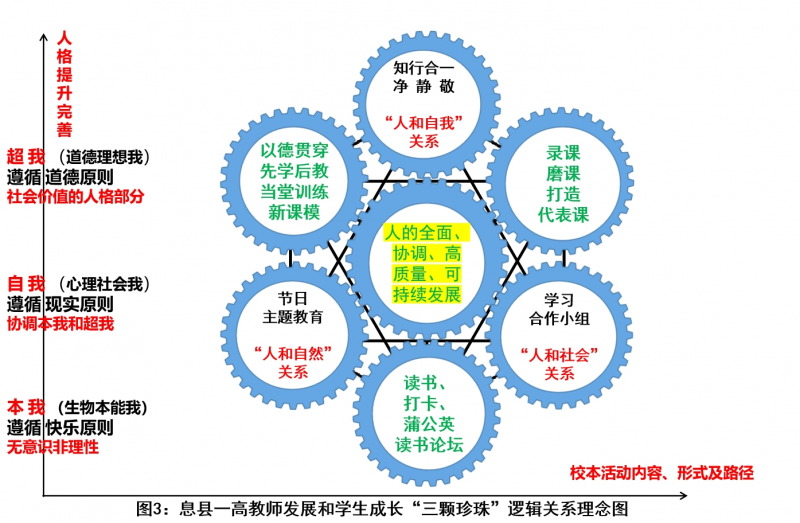 就像人格結(jié)構(gòu)里的本我、自我和超我一樣,三者相互交織,構(gòu)成人格的整體。當(dāng)三者處于協(xié)調(diào)狀態(tài)時(shí),人格表現(xiàn)出一種健康狀況;當(dāng)三者互不相讓,產(chǎn)生敵對(duì)關(guān)系時(shí),就會(huì)產(chǎn)生心理疾病。而教師與學(xué)生的發(fā)展也是一個(gè)由“本我”到“自我”最終達(dá)到“超我”境界的過程。這需要“六顆珍珠”的相互結(jié)合、相互照耀,“六顆珍珠”是實(shí)現(xiàn)人格提升完善的內(nèi)容、形式及路徑。