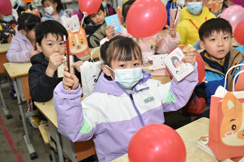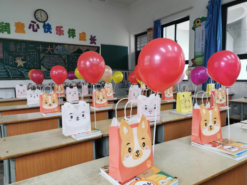 一大早,孩子們根據(jù)學(xué)校要求錯(cuò)時(shí)錯(cuò)峰有序進(jìn)入校園。當(dāng)一年級(jí)的同學(xué)進(jìn)入教室時(shí),都被桌子上五彩繽紛的大禮包和彩色氣球深深吸引。“哇!這袋子里裝的什么呀?”“好多漂亮的氣球啊!”“這是我的新書!”……