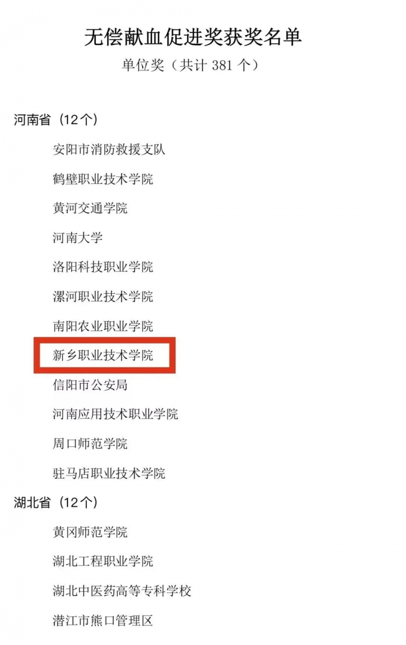 2月14日,國(guó)家衛(wèi)生健康委員會(huì)公布了《關(guān)于表彰2020-2021年度全國(guó)無(wú)償獻(xiàn)血表彰獎(jiǎng)勵(lì)獲獎(jiǎng)?wù)叩臎Q定》,新鄉(xiāng)職業(yè)技術(shù)學(xué)院榮獲2020-2021年度“無(wú)償獻(xiàn)血促進(jìn)獎(jiǎng)”。