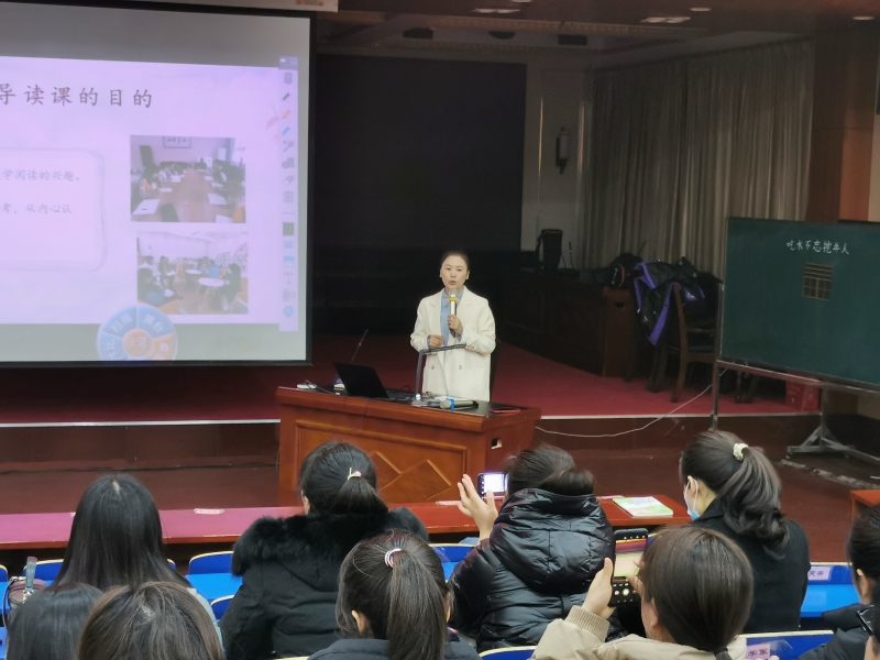 第二個(gè)階段是教研點(diǎn)評(píng)。首先由執(zhí)教教師針對(duì)所執(zhí)教課例進(jìn)行說課和反思,陳老師以“激發(fā)興趣,點(diǎn)燃閱讀火焰”為主題,對(duì)數(shù)學(xué)閱讀導(dǎo)讀課進(jìn)行了簡單的介紹,強(qiáng)調(diào)“導(dǎo)讀”是引領(lǐng)閱讀的意思,數(shù)學(xué)閱讀導(dǎo)讀課的核心是“激趣啟思”。接著是由觀摩教師提出自己的困惑和思考,其中名師李靜表示:從孩子們的整體反應(yīng)就可以感受到數(shù)學(xué)閱讀的魅力,但從學(xué)生們的表達(dá)也深刻的體會(huì)到引領(lǐng)孩子們走進(jìn)數(shù)學(xué)閱讀的世界迫在眉睫。最后由中原名師宋君做點(diǎn)評(píng)和指導(dǎo),宋校長先是指出了這次課例的優(yōu)點(diǎn)和不足之處,接著以蘇霍姆林斯基的一句話:“不會(huì)閱讀的學(xué)生是潛在的差生”,來強(qiáng)調(diào)數(shù)學(xué)閱讀的重要性,指出閱讀是數(shù)學(xué)學(xué)習(xí)的主軸和核心,閱讀力就是學(xué)習(xí)力。在開展數(shù)學(xué)閱讀課程時(shí)一定要明確“教什么”和“怎么教”,要始終把學(xué)生放在課堂的正中央,要能發(fā)掘?qū)W生的興趣點(diǎn)和困惑點(diǎn),幫助學(xué)生在數(shù)學(xué)閱讀中獲得學(xué)習(xí)數(shù)學(xué)的方法和動(dòng)力,促進(jìn)核心素養(yǎng)真正落地生根。