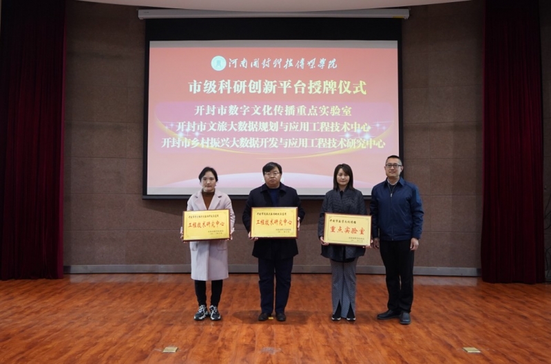 會(huì)上,科研處處長(zhǎng)孟蕓宣讀了1個(gè)省級(jí)、3個(gè)市級(jí)科研創(chuàng)新平臺(tái)的獲批文件。校黨委書(shū)記高金光為省級(jí)科研創(chuàng)新平臺(tái)負(fù)責(zé)人程傳興教授團(tuán)隊(duì)授牌;董事長(zhǎng)郭津分別為 “開(kāi)封市數(shù)字文化傳播重點(diǎn)實(shí)驗(yàn)室”、“開(kāi)封市文旅大數(shù)據(jù)規(guī)劃與應(yīng)用工程技術(shù)中心”以及“開(kāi)封市鄉(xiāng)村振興大數(shù)據(jù)開(kāi)發(fā)與應(yīng)用工程技術(shù)研究中心”三個(gè)科研平臺(tái)授牌。