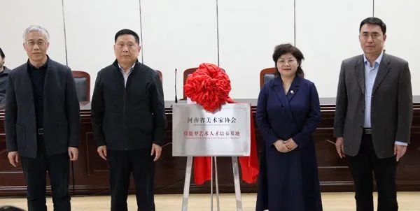 活動(dòng)現(xiàn)場(chǎng),馬國(guó)強(qiáng)、石品、魏小杰、常江為“河南省美術(shù)家協(xié)會(huì)技能型藝術(shù)人才培養(yǎng)基地”揭牌。