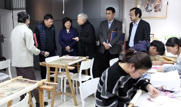 活動(dòng)結(jié)束后,馬國(guó)強(qiáng)、石品、丁昆、連俊洲等專家一行在魏小杰的陪同下,分別參觀了孫蕊工作室和林靜工作室。在孫蕊工作室內(nèi),多位新生正在孫蕊老師的輔導(dǎo)下認(rèn)真學(xué)習(xí)汴繡技術(shù)。各位專家在參觀完工作室后,對(duì)于河南輕工職業(yè)學(xué)院開(kāi)設(shè)的工作室給予了充分肯定,對(duì)河南輕工職業(yè)學(xué)院在藝術(shù)領(lǐng)域所做的努力給予了高度好評(píng)。