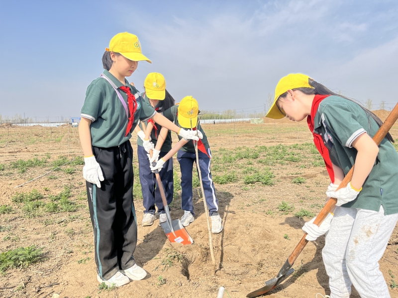 同學們認領專屬小樹苗后,拿起小鐵锨,提起小水桶,擼起袖子和小伙伴分工合作,根據(jù)樹苗的大小,挖出適合的樹坑,再將樹苗小心地放進坑中,各個環(huán)節(jié)銜接有序,配合默契。同學們齊心協(xié)力給一棵棵綠苗安置“新家”,期間還不時交流種樹小技巧,認真執(zhí)行每一步,讓小樹苗茁壯成長。活動中處處都是忙碌的身影,處處都有勞作的歡聲笑語,為勞動基地增添一道春天的靚麗色彩。