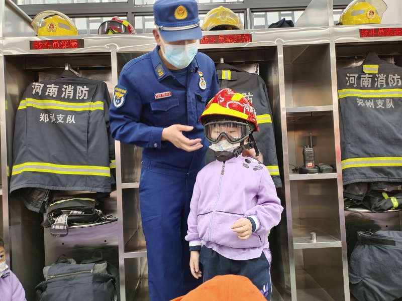 懷著期待和激動(dòng)的心情,老師帶領(lǐng)著寶貝們和家長(zhǎng)朋友們準(zhǔn)時(shí)到達(dá)消防站,消防站郭隊(duì)長(zhǎng)給孩子們講解了滅火戰(zhàn)斗服和搶險(xiǎn)救援服的相關(guān)知識(shí)。當(dāng)郭隊(duì)長(zhǎng)為孩子們戴上消防安全帽的時(shí)候,孩子們把背挺得直直的,輕輕地?fù)崦约侯^上的帽子,仿佛自己就是個(gè)小小消防員。