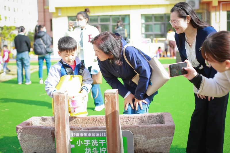 金水區(qū)第八幼兒園戶外場地開闊,為幼兒提供了豐富的材料以支持戶外自主游戲的開展,讓孩子們可以在綜合區(qū)、積木搭建區(qū)、涂鴉區(qū)、沙池區(qū)、泥池區(qū)、攀爬區(qū)等自主游戲區(qū)域盡情的釋放天性。活動中參會老師與孩子們近距離接觸,不時駐足,或記、或問、或拍照記錄下一個個精彩的畫面,寓教于樂。金水一幼教育集團秉持自主游戲精神,最大限度滿足幼兒游戲的需要,在戶外自主游戲區(qū)域投放了類型多樣且操作性強的游戲材料,供幼兒發(fā)揮想象,自由組合。幼兒在輕松自然、平等友好的游戲氛圍中,獲得最大程度的發(fā)展。戶外自主游戲開展的如火如荼,室內(nèi)區(qū)域活動同樣演繹著繽紛精彩。種植區(qū)、主題墻、游戲故事檔案、環(huán)境創(chuàng)設(shè)上充分體現(xiàn)了與幼兒的有效互動,空間布局和材料的投放,處處體現(xiàn)“兒童為本”的教育理念。