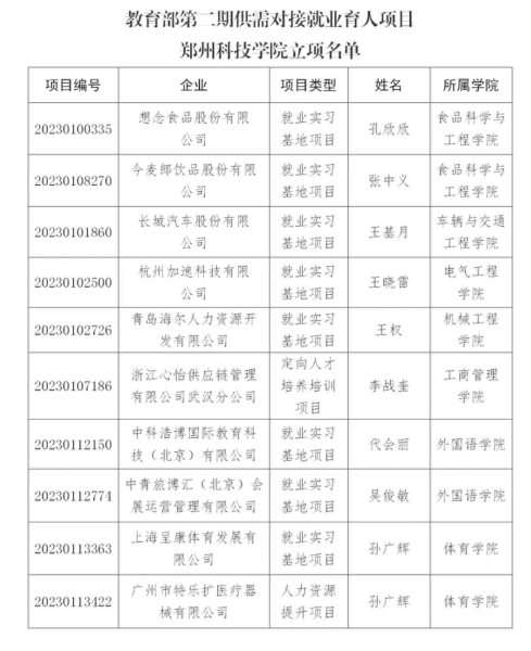 4月13日,記者從鄭州科技學(xué)院獲悉,在近日教育部高校學(xué)生司公布的《關(guān)于公布第二期供需對接就業(yè)育人項(xiàng)目立項(xiàng)名單的通知》(教學(xué)司函〔2023〕6號)中,該校與長城汽車股份有限公司、杭州加速科技有限公司、想念食品股份有限公司等企業(yè)合作的10個(gè)供需對接就業(yè)育人項(xiàng)目獲批立項(xiàng),分布裝備制造、食品加工和文旅藝術(shù)等行業(yè)領(lǐng)域。