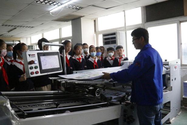 了解了印刷廠的發(fā)展歷程后,師生們跟隨魏冉經(jīng)理來到印刷廠車間,只見潔凈整齊的環(huán)境和一排排大型的印刷機(jī)器在秩序井然地運轉(zhuǎn)著。魏冉經(jīng)理向大家詳細(xì)講解了各種機(jī)器的工作原理,以及書本的制作流程。有切割機(jī),把紙切割成半成品;印刷機(jī),每小時能印上萬張紙;覆膜機(jī),在紙上覆上一層薄膜;膜切機(jī),將做好的紙張切成各種形狀……同學(xué)們也拿好紙和筆,邊聽邊記錄下來,不放過任何一個學(xué)習(xí)的機(jī)會。